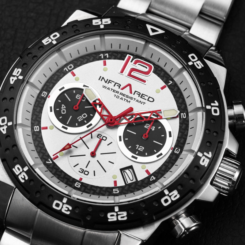 from the silver brushed bezel, the embossed dial design, and the sports-colored skeleton hands,